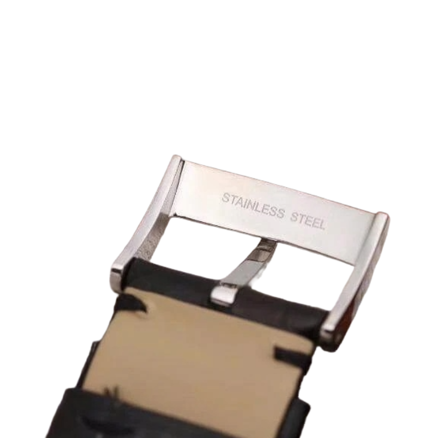 The black leather strap adds another layer of classic appeal. It’s comfortable. adjustable to fit all wrist sizes. and features a stainless steel fold clasp that ensures both security and convenience. The overall aesthetic is refined. making it ideal for business attire. evening events. or elevating your everyday wardrobe.