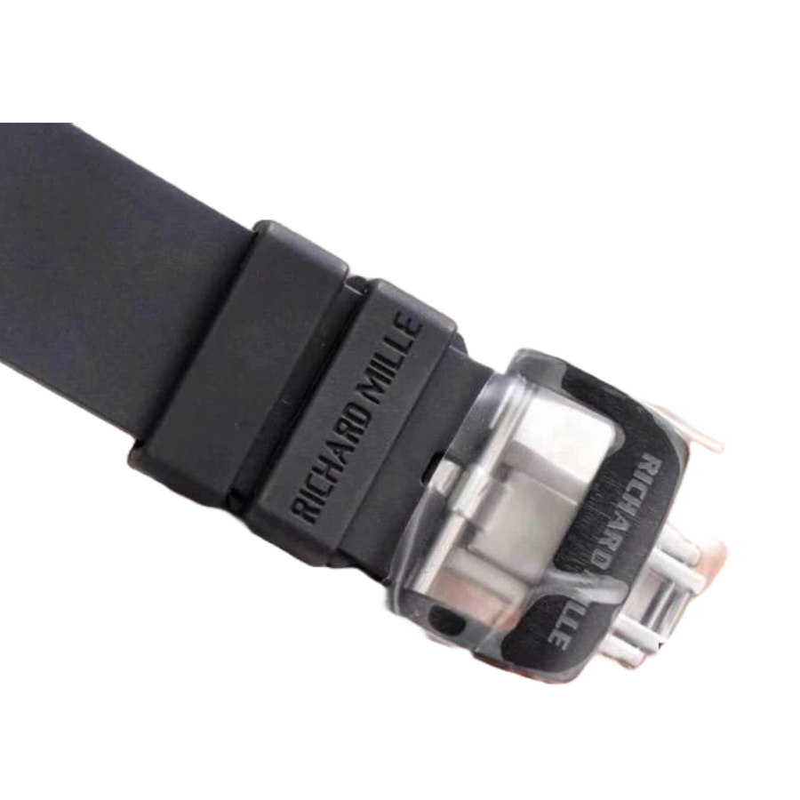 The black rubber strap offers sporty elegance and is tailored for comfort. durability. and secure daily wear. It features adjustable links that mirror the fit of the original RM52-01 and is secured with a black fold clasp made from 316L stainless steel. This ensures both functionality and a seamless aesthetic from case to clasp.