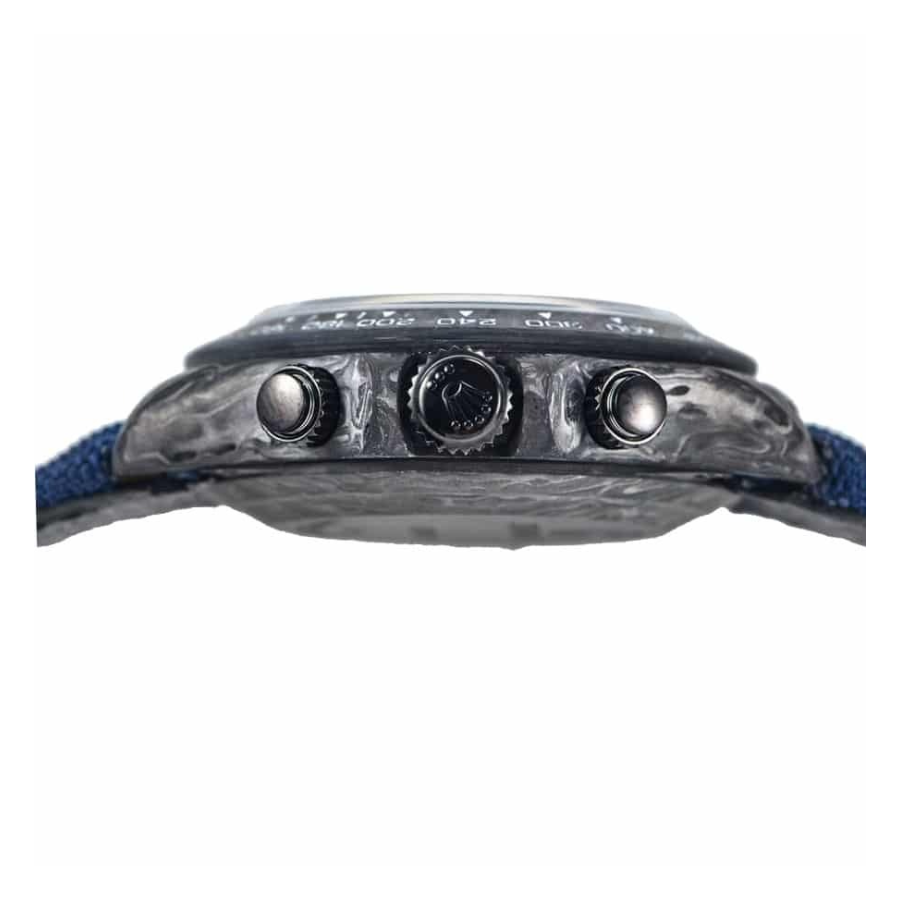 With its robust yet sleek 40.00 mm size and 15.40mm thickness. the Daytona Cosmograph fits comfortably on your wrist. while its scratch-resistant sapphire crystal ensures lasting clarity and protection. The fabric bracelet. designed for all sizes. wraps snugly around your wrist. secured by a 904L stainless steel deployment clasp in matching forged carbon color. As you tighten the clasp. you’ll notice the intricate color fish pattern dial with stick and dot indices come into clearer view. a unique design that sets this replica apart from generic copies.